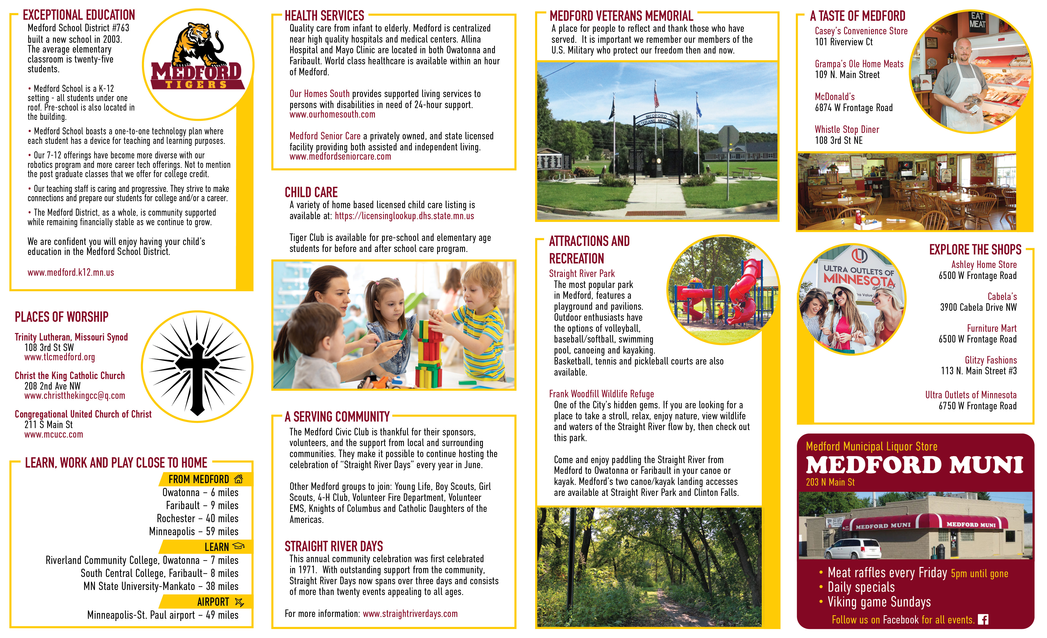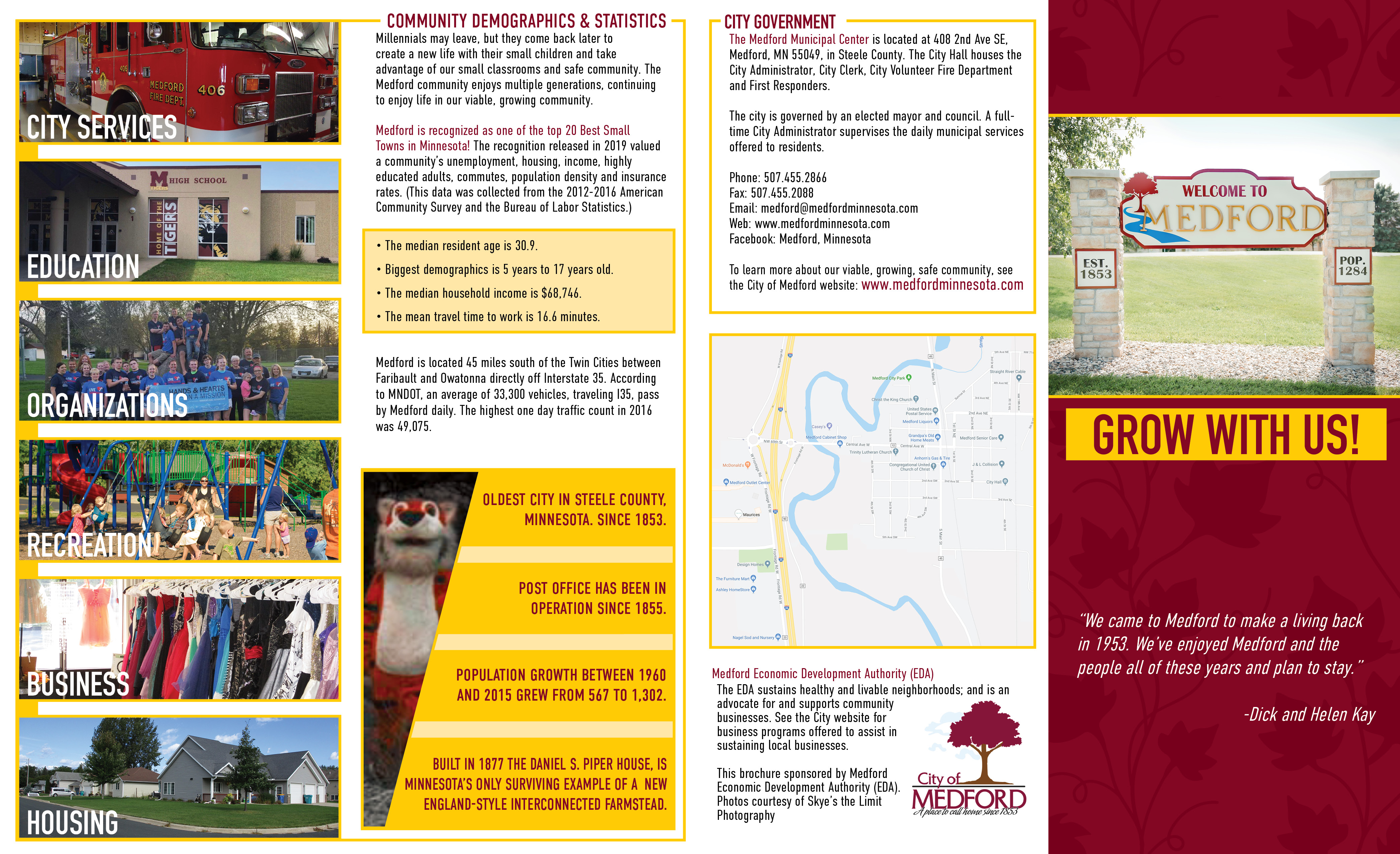 Medford is an ideal location for current and future businesses. The community is located along the I35 corridor. It is minutes from Owatonna and Faribault, and within an hour of Rochester, Mankato and the Twin Cities Metro Area. Land is available on either side of the interstate for business and residential development.